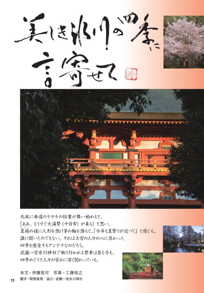 誰に聞いたのでもない。それは大宮の人々の心に具わった四季を感受するアンテナなのだろう。武蔵一宮氷川神社で執り行われる祭事は昔も今も、四季めぐりと人々の営みに深く関わっている。