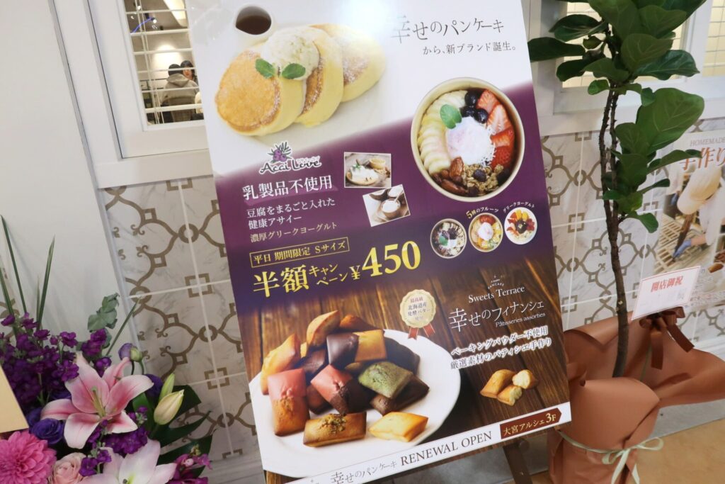 JR大宮駅西口の目の前のある大宮アルシェ3階に「幸せのパンケーキ」の新ブランド、オリジナルアサイーボウル専門店『アサイーラブ 大宮店』と、焼き菓子専門店『Sweets Terrace 大宮店』が12月6日に同時オープンしました。