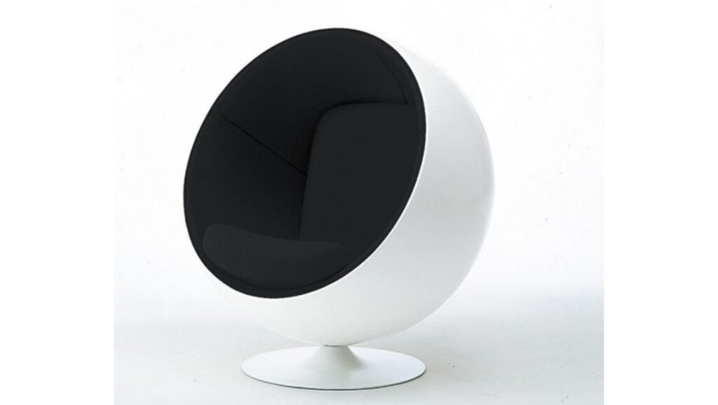 今回購入した《ボールチェア》は、1996年から2016年までデザイナーから認可を受けて製造を行ったアデルタ社製のものです。シェルが白、座面が黒のタイプで、アールニオ自身が最も好んだ配色といわれています。