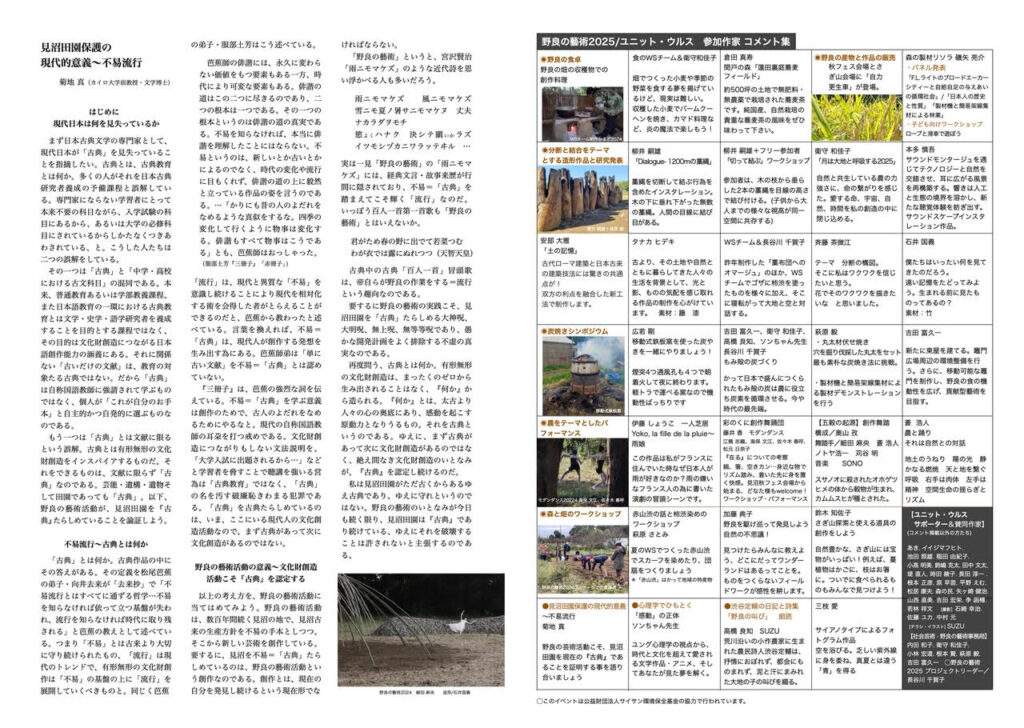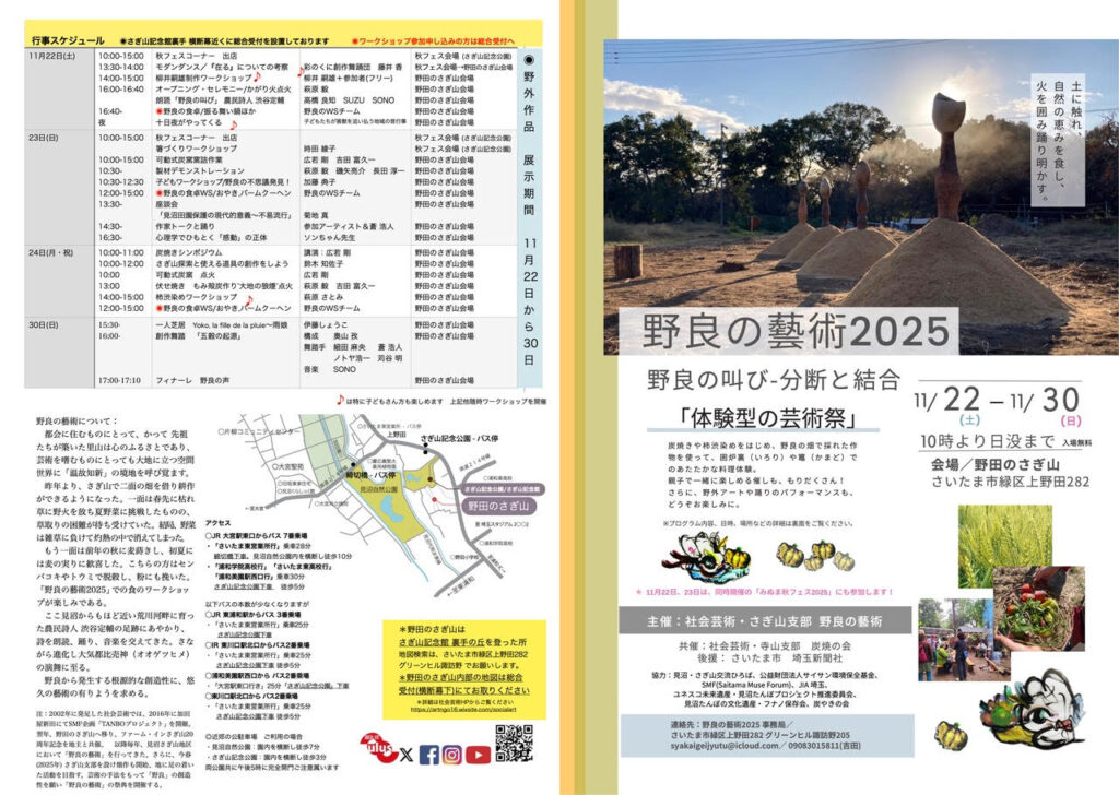 「野良の藝術2025」が11月22日(土)~24日(月・祝)、30(日)に、さぎ山記念公園に隣接した緑地で開催されます。主催は芸術家集団「社会芸術・さぎ山支部 野良の藝術」で、今年のテーマは「野良の叫びー分断と結合」。