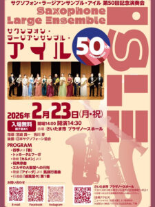2026年2月23日(火祝)、サクソフォン・ラージアンサンブル・アイル 第50回記念演奏会をさいたま市プラザノース ホールで開催します。