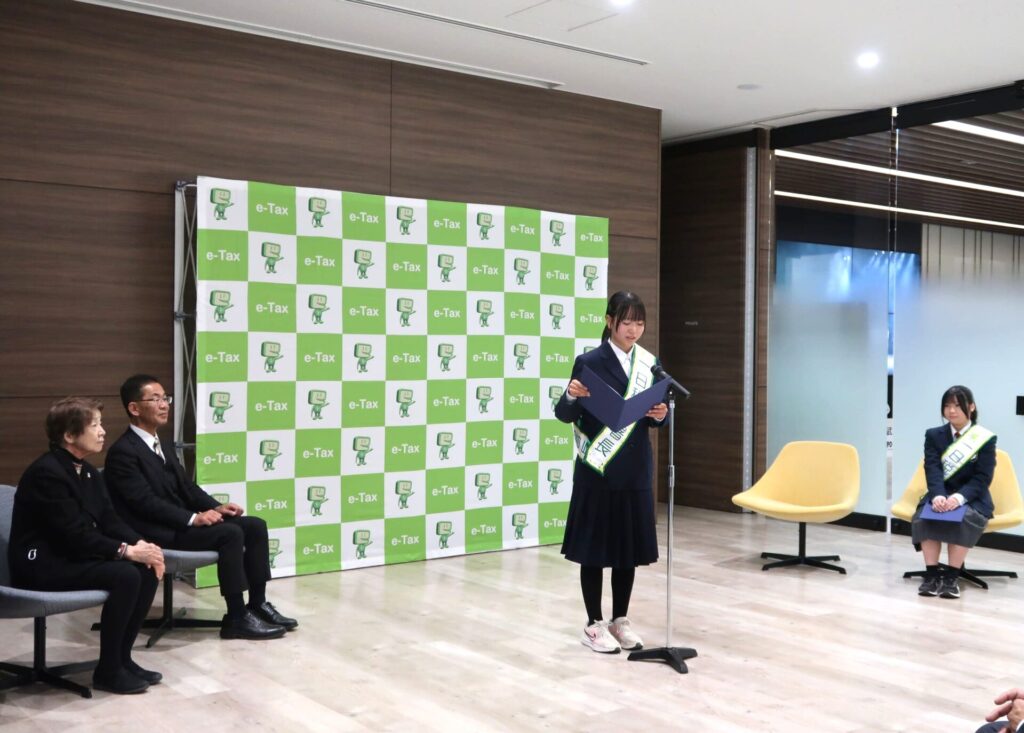 蔵楽さんは「税について考えたことを、他の人にも伝えたいです」と話し、塚越さんは「作文を通して、税を身近に感じました。安心してくらせるような社会になってほしい」と話しました。