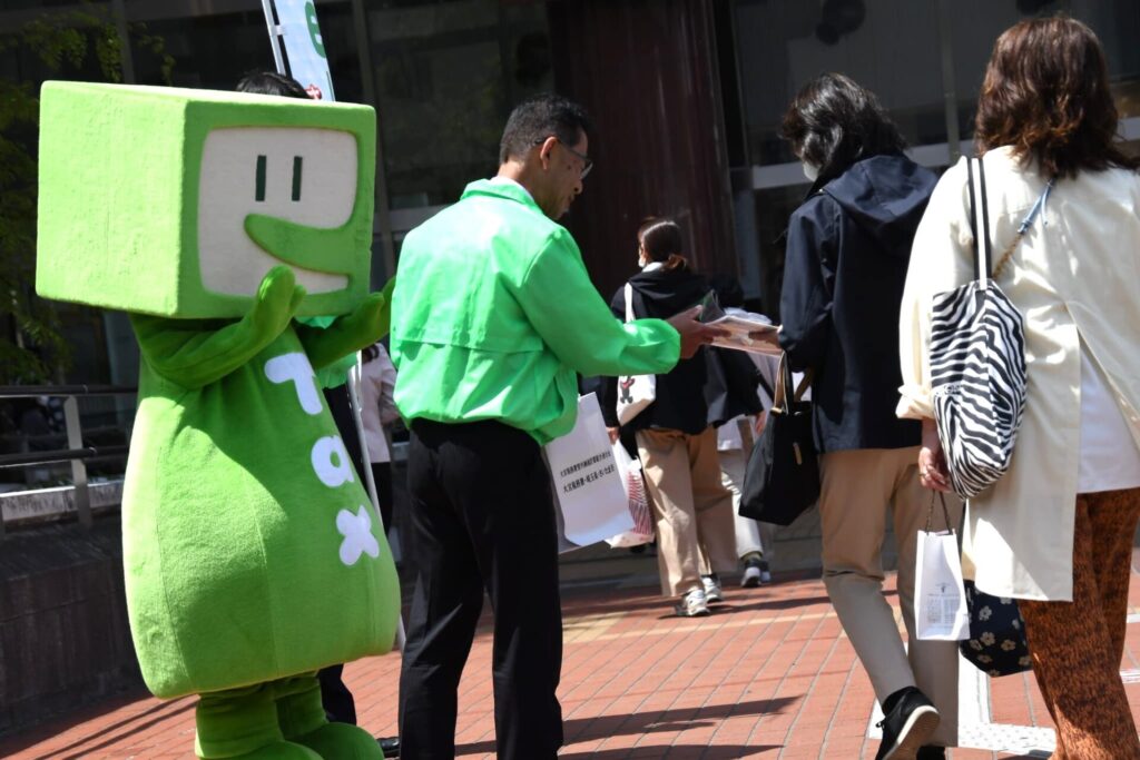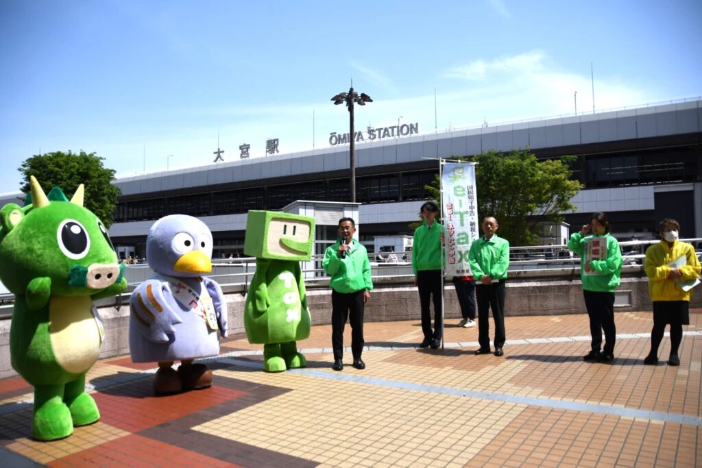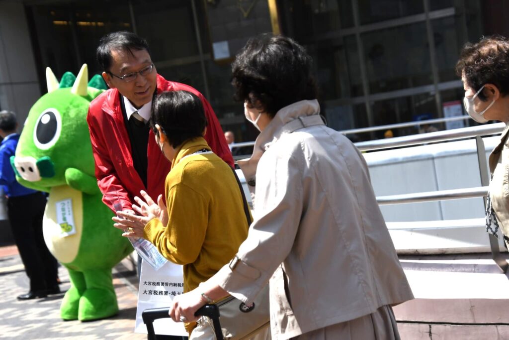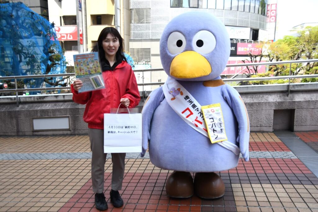 歩行者にチラシや啓発用のポケットティッシュやリーフレットなど250セットを配布。インターネットを通じて税金の納付もできる「e-TAX」PRキャラクター『イータ君』、埼玉県『コバトン』、さいたま市の『つなが竜ヌゥ』も登場し、期限内納付を呼びかけました。